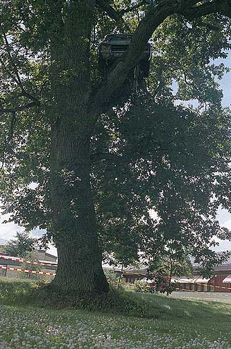 Den grå personbil som konstnären Ian Newbery hängde upp i en stor ek i en av stadens mer traditionsbundna gröna lungor, sjukhusparken till Sankt Sigfrids sjukhus, väckte våldsamt rabalder redan första dagen, då den stora kranbilen rullade in på sjukhusområdet. Det var ju inte detta landstinget hade tänkt sig med en trevlig utomhusutställning på temat in och utvandring, lät man förstå.