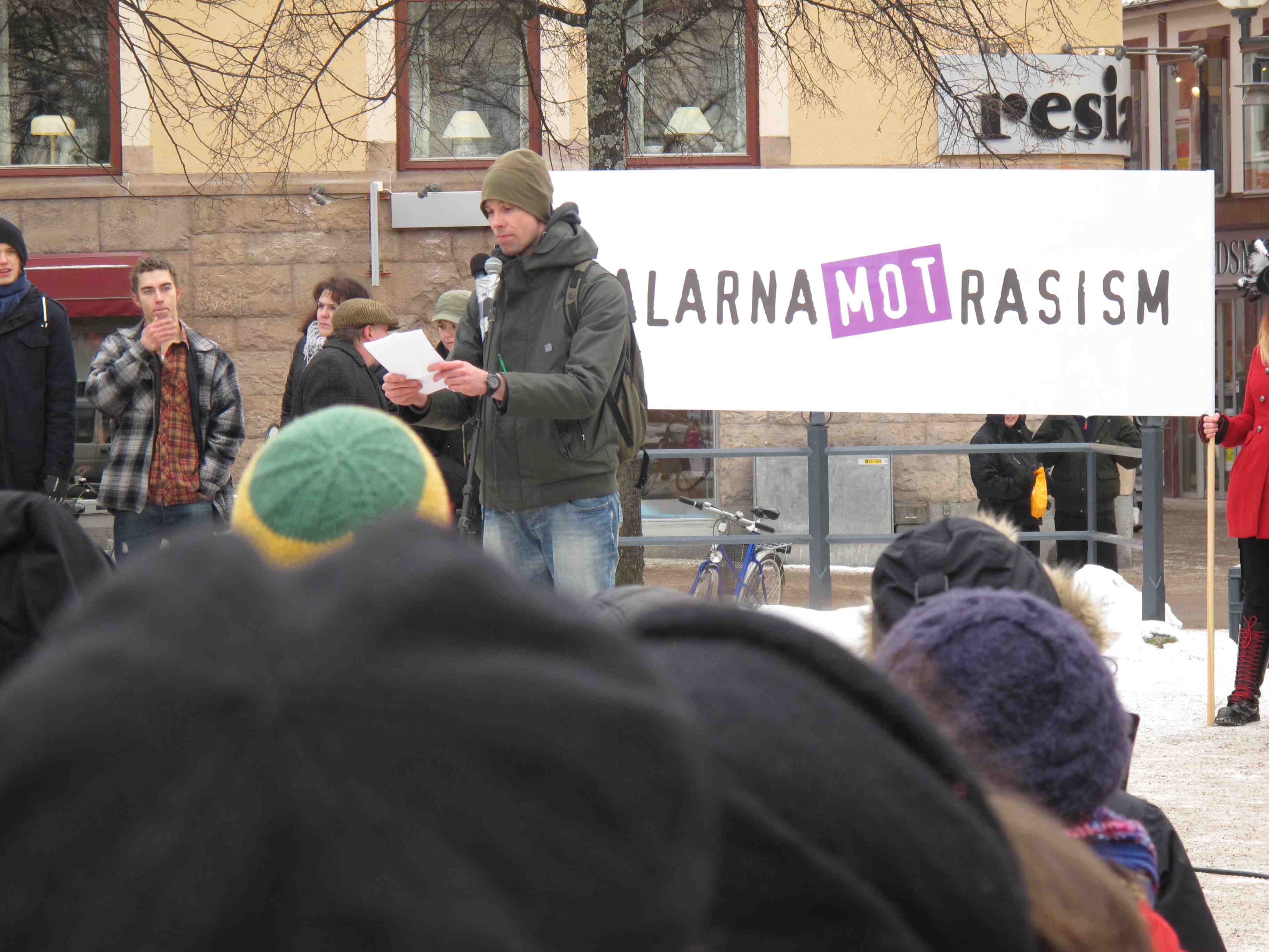 Jonathan Möller från organisationen Expo talade liksom socialdemokraten Peter Hultqvist som höll ett bra tal helt utan manus. Peter Hultqvist fick representera hela Dalabänken eftersom det med så kort varsel var svårt att få alla att vara på plats, men han poängterade att alla från höger till vänster stödde manifestationen. Daniel Riazat berättade om när han och hans familj kom till Sverige för 11,5 år sedan. Han berättade om det stöd och den solidaritet som familjen fick.– Det är svenskhet för mig! DALA-DEMOKRATEN 2012-02-11