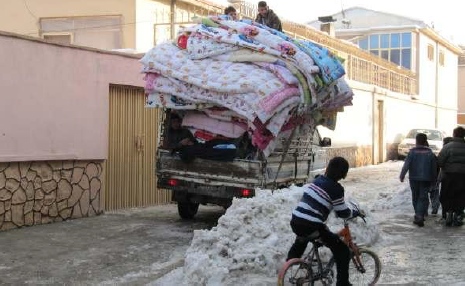 Afghanska fredsvolontärer lämnar täcken, som tillverkats av en kvinnogrupp, till utsatta människor i Kabul.