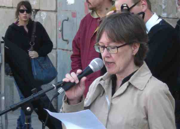 Clara Quarfood Lindberg, Föreningen Afghanistansolidaritet: "- Den 6:e juni delas det på Drottningholm, officiellt och ceremoniellt ut medaljer till förtjänstfulla soldater. Så smygs idén om det nödvändiga och naturliga Kriget in i våra medvetanden. Idén om Kriget i vilket våra pojkar och våra flickor tjänar landet med risk för sina liv." Foto: Henrik Persson