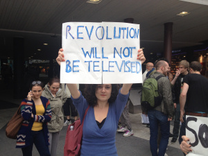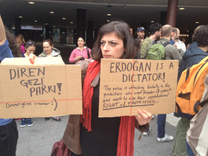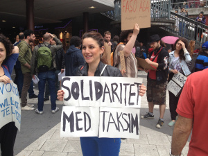 Ungefär trehundra demonstranter samlades på Sergels torg i Stockholm för att visa sin solidaritet. Ungdomarna ropar: ”Avgå Erdogan!” och ”Krossa fascismen!” En av protestledarna tar fram en gitarr och sjunger en kampsång. Så blir det ringdans.