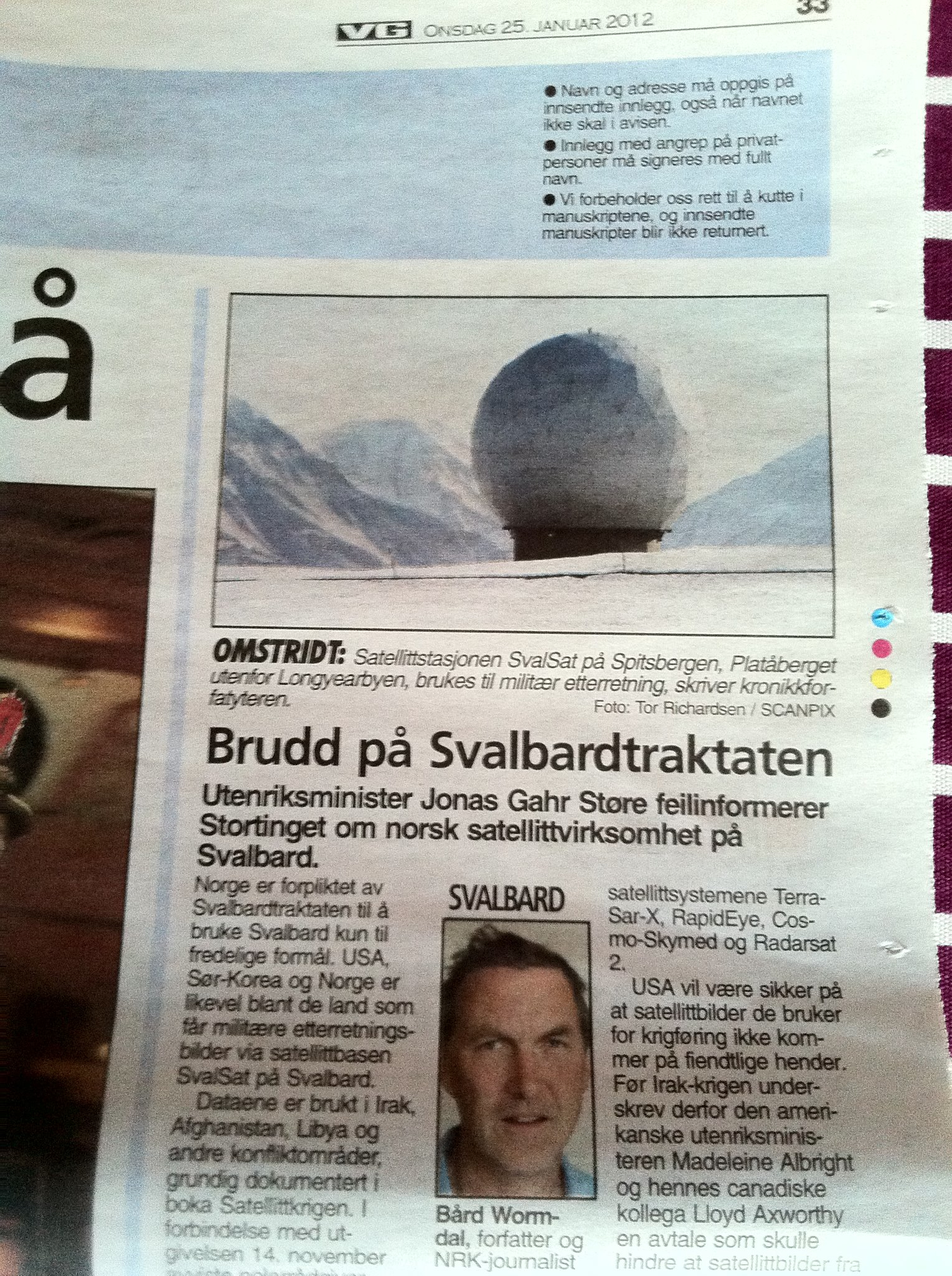 Utenriksminister Jonas Gahr Støre feilinformerer Stortinget om norsk satellittvirksomhet på Svalbard. Debattinnlegg VG 25.1.12