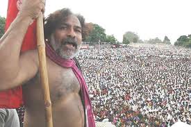 På bilden syns den indiske sångaren Gaddar som under flera decennier har sjungit sånger om naxaliternas kamp. I bakgrunden syns de 200 000 människor som kom för att se honom efter att han levt underjordiskt i flera år. Han är en levande legend som reser runt med sin kulturgrupp och sprider hoppets och upprorets sånger.