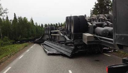 En av Northland Resources lastbilar gick omkull söder om Kaunisvaara. – Släpet ligger upp och ner och det är svart av malm överallt, säger förbipasserande Mia Kumpula till NSD. Det är sådant folk väntat på, när malmen körs på långtradare på ännu inte tillräckligt utbyggda vägar.