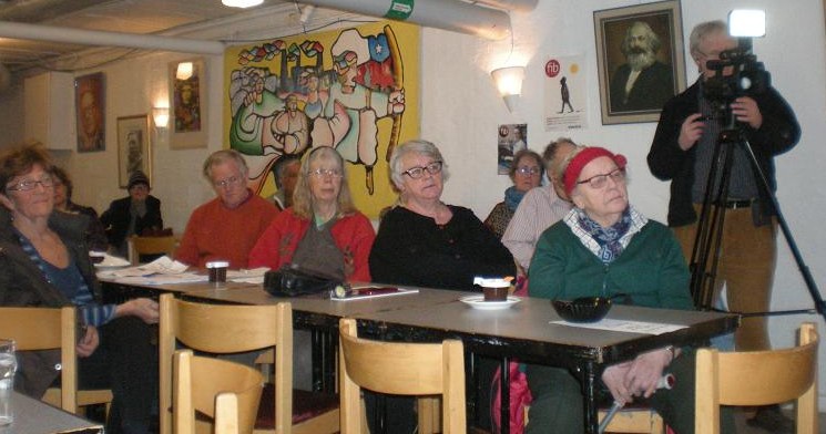 En kunnig och engagerad publik bestående av cirkeldeltagare och andra intresserade hade samlats i Victor Jaraförbundets Stockholmslokal 9/4. Politikerna fick svara på frågor och höra inlägg. Foto: Henrik Persson