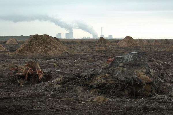 Så här ser det ut, när ett landskap städas från allt levande. Träderna på marken har ännu för några månader sedan varit del av pralěs (urskog) Běła Wóda, där det i 1000 år har funnits gudstjänster. I början hedniska, sedan kristna. Hit hade lokala sorberna flytt, när de förfoljades för sin tro eller av andra skäl. Nu är orten jämnad med marken. Fotograf: Julia-Jaro-Oberer