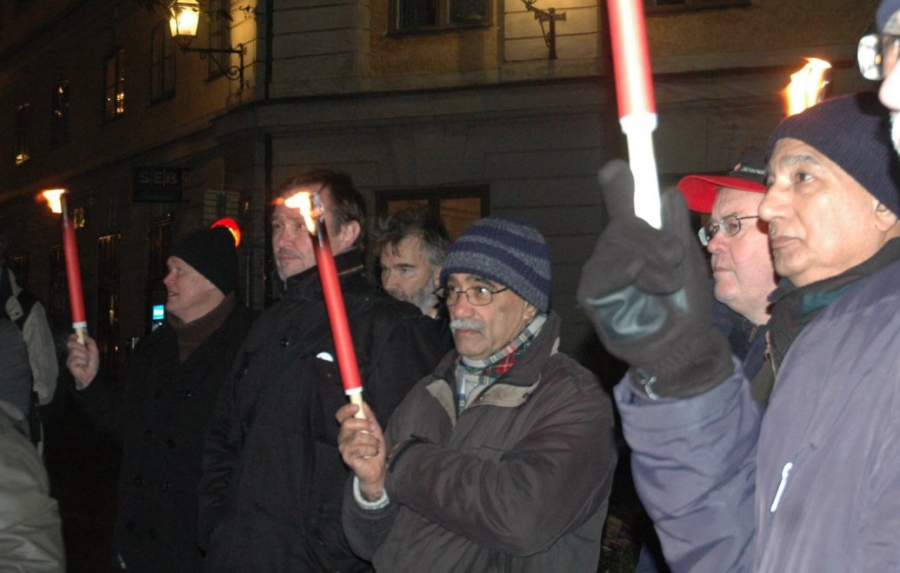 Vi fredsvänner, vi krigsmotståndare, som under årens lopp stått här på Mynttorget, vi och andra runt om i landet som protesterat mot krigspolitiken, som skrivit och debatterat för att bilda opinion mot våldet har varit övergivna av etablissemanget. Men vi har inte accepterat tystnaden. Och historien kommer att ge oss rätt, ger oss redan rätt. Och en dag, inte alltför avlägsen, kommer den historien att skrivas. Det finns de som har anledning att ängslas för den dagen och för historiens dom. Men inte ni som står här i decembermörkret och manifesterar för fred. Ge inte upp, historien är på vår sida!