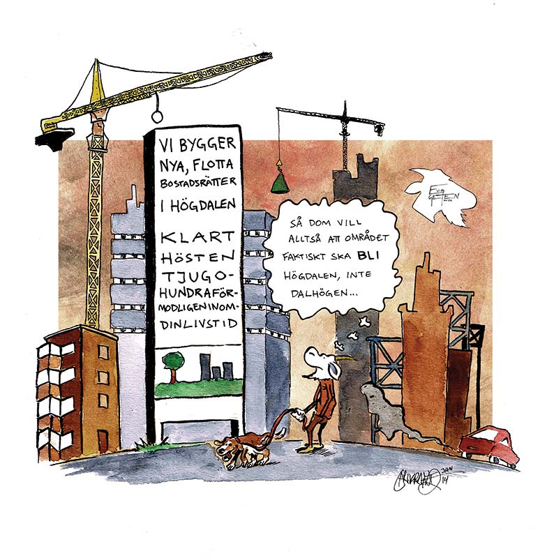 – Att det byggs nytt i Högdalen leder inte automatiskt till att hus runt omkring får högre hyror. Det betyder i stället att servicen finns kvar. Jag skulle snarare bli orolig om det inte byggdes där jag bor. Det går förstås att se allting från två vinklar, men jag vill inte sätta ett likhetstecken mellan nya hus och högre hyror på redan befintliga lägenheter. Risken uppstår först när din egen hyresvärd börjar renovera, men det är en diskussion man får ta med värden.