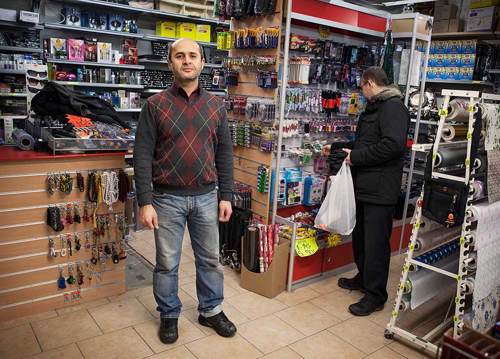 CENTRUMPLANER? Bashir Jakubi lutar sig mot en ställning med blommönstrade plastdukar. På hyllorna närmast kassan trängs örhängen, halsband, ringar och hårsnoddar. En man betalar för ett halsband med en berlock i form av ett hjärta.