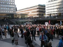 - Plakat/medlemmar från (mp), (s), (v). Orsak - fortsatt baksmälla efter valet? En viktig orsak är nog också samtliga dessa partiers otydlighet i frågan. Åtminstone om vi ska gå efter massmedieuppgifter. Sedan kan det ju funnits en del folk närvarande ändå från dessa partier, det var ju en partipolitiskt obunden demonstration där partier väl helst inte ska profileras. Några som dock tydligt profilerade sig med flaggor och plakat var latinamerikaner med kubanska flaggor och bilder på Che Guevara. Om detta kan man tycka mycket - men de var i alla fall där och deltog.