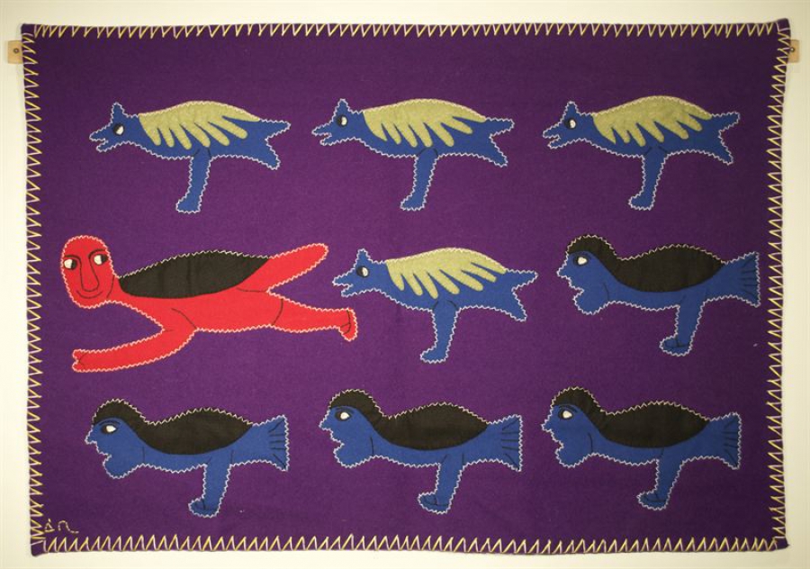 Nunavut är lika stort som Västeuropa till ytan, men en av de mest glesbefolkade regionerna i världen. Vävnadernas bildvärldar är kopplade till ett muntligt berättande, av stor betydelse för inuiterna som saknar nedtecknad äldre historia. Ett återkommande motiv är hur gränserna mellan andliga och fysiska världar suddas ut.a221d43302390802_800x800ar.jpg