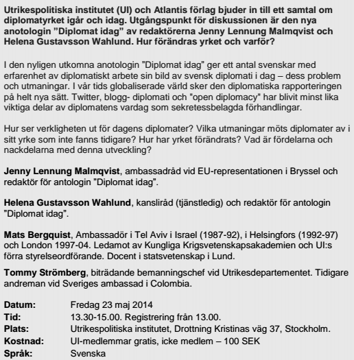 Utrikespolitiska institutet (UI) och Atlantis förlag bjuder in till ett samtal om diplomatyrket igår och idag. Utgångspunkt för diskussionen är den nya anotologin "Diplomat idag" av redaktörerna Jenny Lennung Malmqvist och Helena Gustavsson Wahlund. Hur förändras yrket och varför?