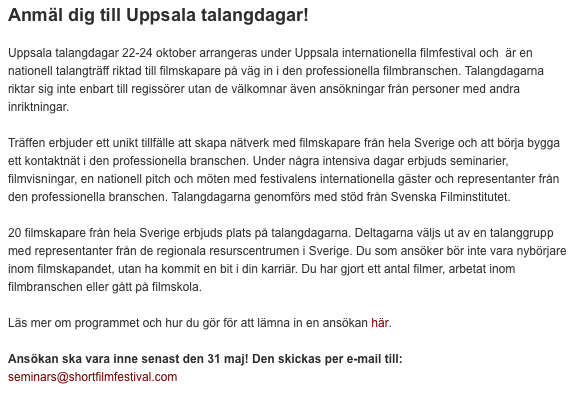 Uppsala talangdagar 22-24 oktober arrangeras under Uppsala internationella filmfestival och är en nationell talangträff riktad till filmskapare på väg in i den professionella filmbranschen. Talangdagarna riktar sig inte enbart till regissörer utan de välkomnar även ansökningar från personer med andra inriktningar.