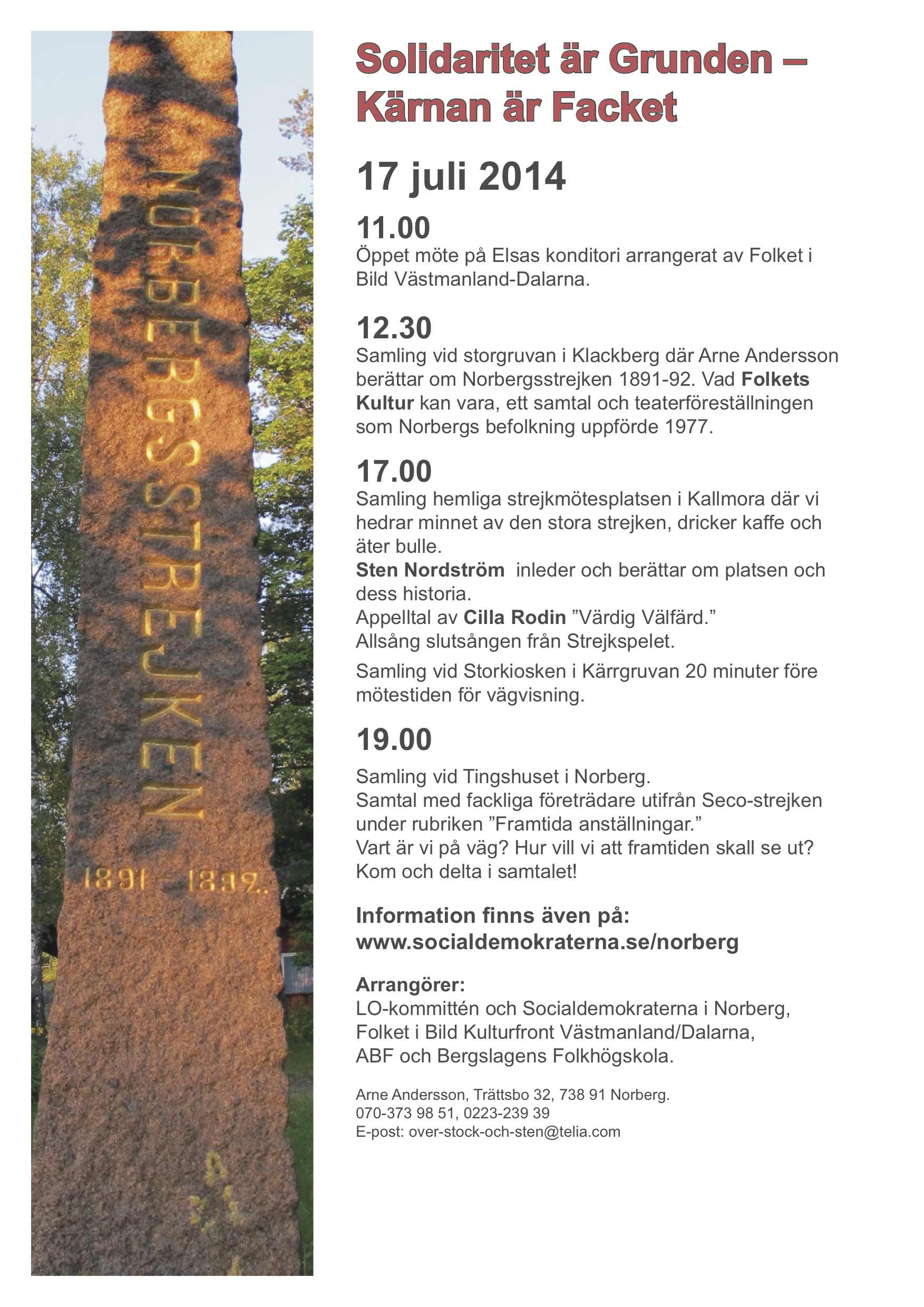 SOLIDARITETEN ÄR GRUNDEN - KÄRNAN ÄR FACKET. Arbetarkommunen i Norberg har sedan 1988 låtit hedra minnet av den stora strejken 1891-92 genom att samlas vid en minnessten i skogen där arbetarna höll hemliga möten för att undkomma förföljelser av polis och gruvförvaltning för sitt fackliga engagemang. Samlingen äger rum den 17 juli klockan 17.00 varje år. Sedan år 2009 deltar FiB/K Västmanland-Dalarna som medarrangör.