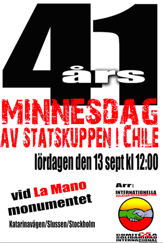 Internationella Solidaritetskommittén i Stockholm håller i samband med 41 årsdagen av militärkuppen i möte vid La Mano, lör 13 sept kl 12.00 Välkommen!