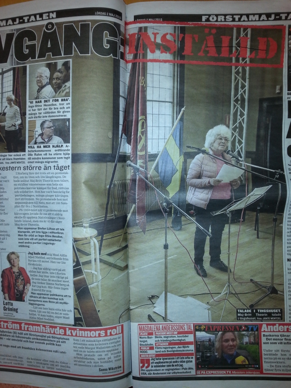 Fagersta posten uppmärksammade mötet och även Expressen (se bild). Sammanfattningsvis ett förstamaj-firande med innehåll och eftertanke blandat med kulturinslag med tänkvärt innehåll gestaltat av ”Lycklig ungdom” Malin Loman och Elinor Karlson.