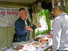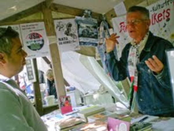 Böcker, tidskrifter, handarbete och nyplockade smultron såldes, pengar samlades in till Ship to Gaza och många diskussioner fördes. Fotot visar pågående agitation mot det imperialistiska övergreppet på Libyen. Vännen Islam, som hungerstrejkat i israeliskt fängelse i kampen för Palestina, lyssnar.
