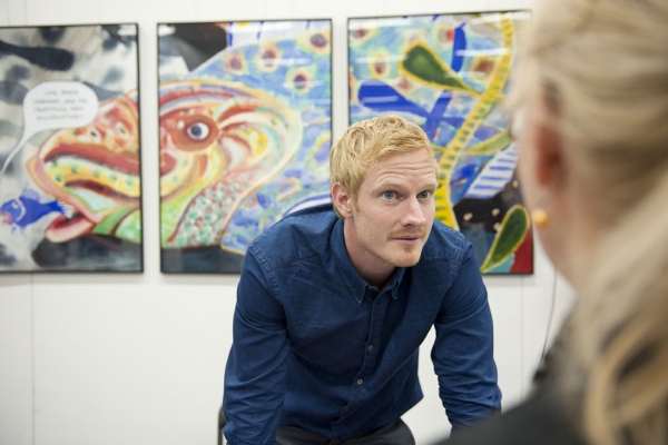 I vår lilla monter pryddes väggarna av en stor färgrann triptyk av Robert Nyberg (varav den vänstra bilden är omslaget till FiB/K nr nio) och en våra omslagsbilder som Botox gjort till tidningen. Satirarkivet presenterades via en Internetuppkopplad dator. Det som fångade mångas uppmärksamhet och intresse var en datorskärm som visades ett bildspel med vår baksidestecknare Hans Lindströms satirbilder. Det blev många skratt.