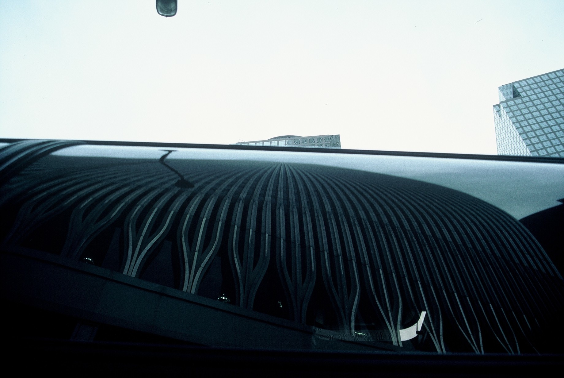 När jag till slut tar fram min kamera, har jag sett och valt ut något som är mer begripligt att dokumentera. Jag har vänt mig mig om och upptäckt en parkerad limousine, där de karaktäristiska betongpelarna på World Trade Center avspeglar sig, likt "betongränder" på bilens buktiga sidoruta. Jag tar en bild.