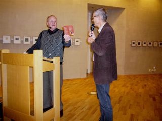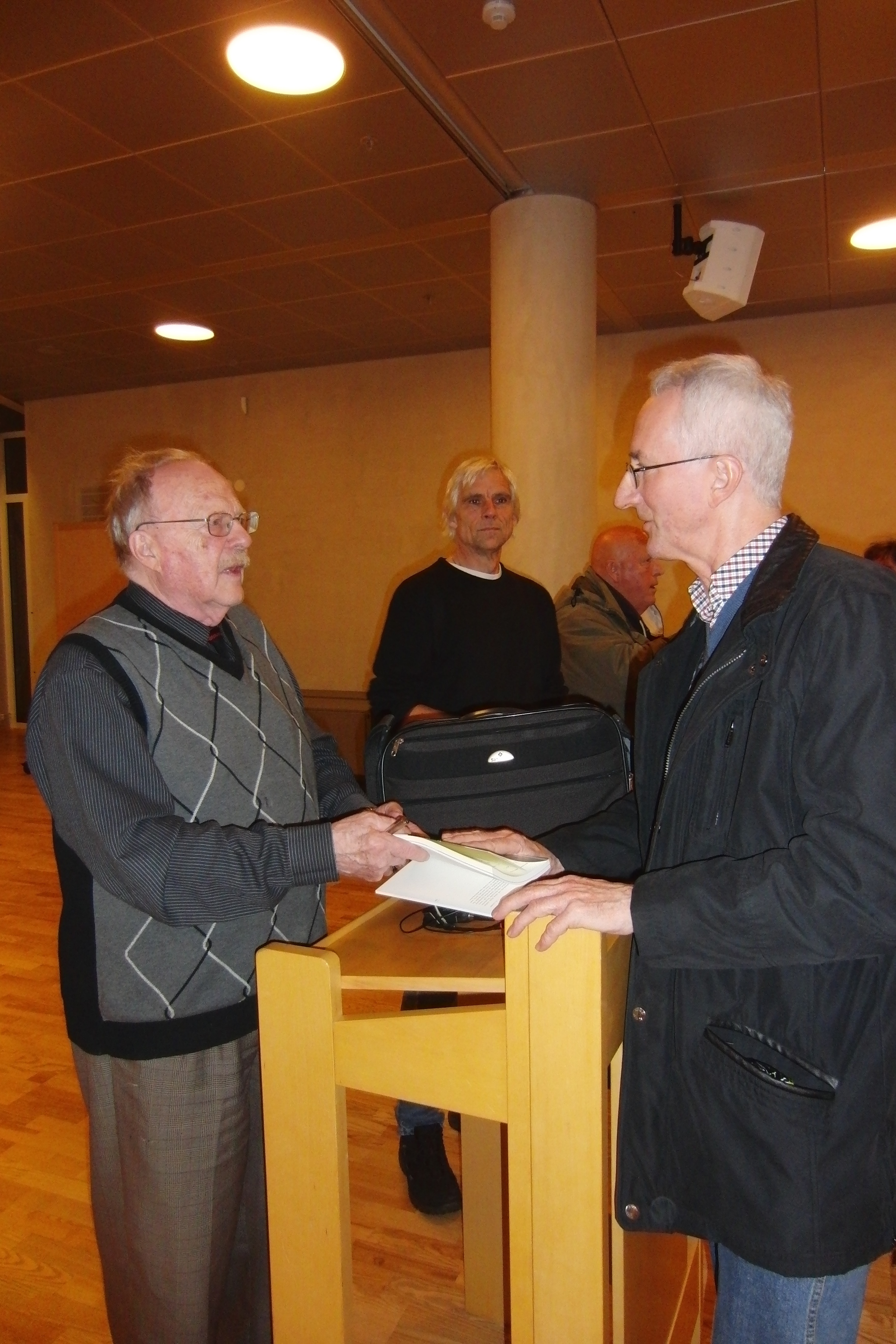 Jan Myrdal avtackas med en ljudbok av Pär Lagerkvist, överlämnad av Växjö FiB avdelnings ordförande Ulf Nilsson.