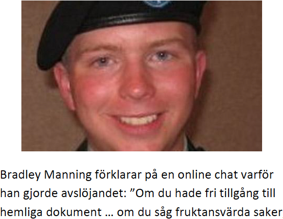 2012-08-26 SvD "I veckan inleds förhandlingarna inför den förestående krigsrätten mot Bradley Manning, soldaten som läckte uppgifter till Wikileaks om USA:s krigföring i Irak och Afghanistan. I två nyutkomna böcker granskas Mannings liv och motiv."
