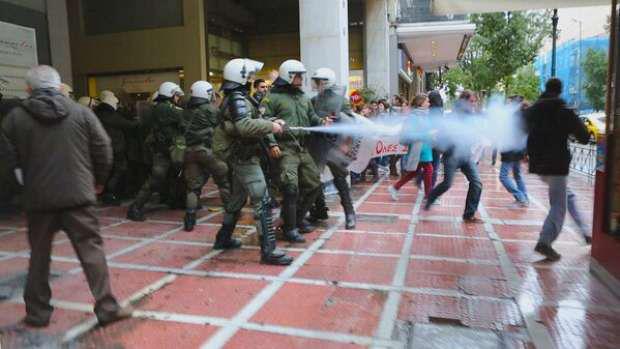 Syriza ungdomar och parlamentsledamöter attackeras av kravallpolis vid protesterna 14 februari mot finansministeriets förslag att sänka minimilönen som ansågs vara för hög.