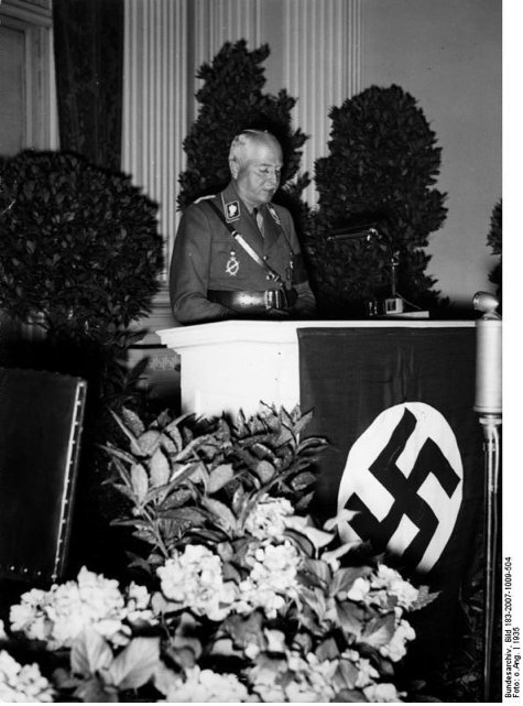 Karl Edvard av Sachsen-Coburg-Gotha (nuvarande kungens morfar), invigningstalar för nazistiska kvinnoförbundet. Karl Edvard var SA-Obergruppenführer och 1934-1945 ordförande för Tyska Röda korset, som efter det nazistiska maktövertagandet underställdes regimen och uteslöts från Internationella Röda korset. 1936-1945 var Karl Edvard dessutom ledamot av den tyska riksdagen som representant för Nazistpartiet.