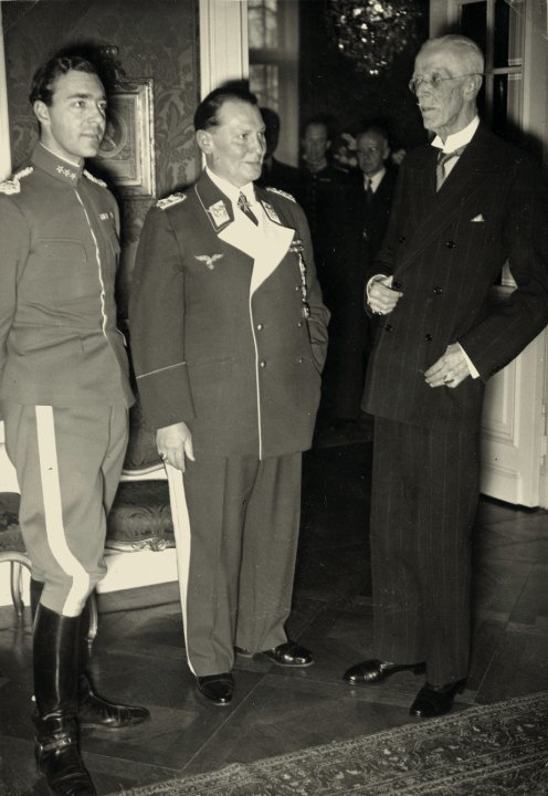 Prins Gustaf Adolf (pappa till nuvarande svenske kungen), Hermann Göring och Gustaf V. Berlin, februari 1939. En av bilderna ur Maj Wechselmanns "En Liten Antirojalistisk Film".