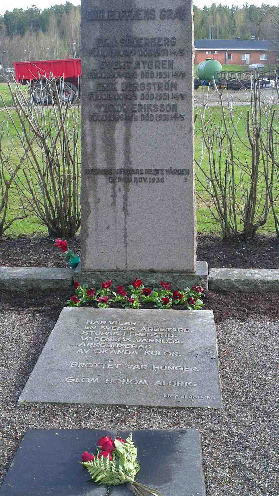 Här vilar en svensk arbetare stupad i fredstid vapenlös värnlös arkebuserad av okända kulor Brottet var hunger Glöm honom aldrig