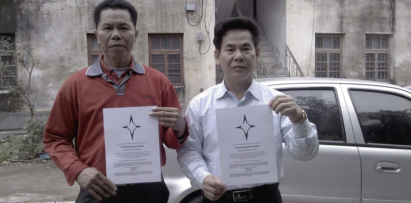 The Board of directors in Stella Bianca has unanimously decided to choose Yang Zaixin and Su Tianjin as the Holme’s of the year 2012 for together and individually, with great personal risk and in spite of painful repression from the economical and political power and all surrounding wannabe’s, taking the fight against grabbing and environmental degradation of their land and for the values that constitutes the rule of law.