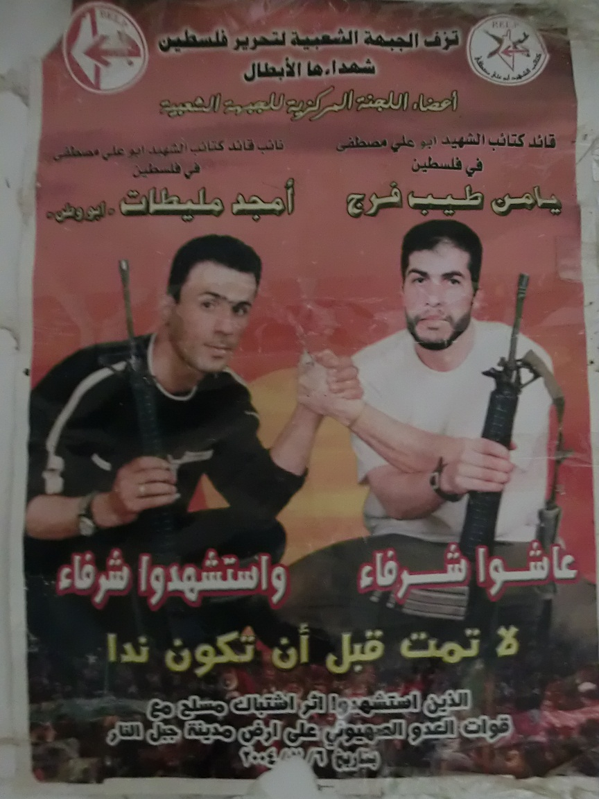 Allam förhördes i 60 dagar under vilka han fick utstå olika former av tortyr, bland annat genom s.k. Shebe (att tvingas stå i en obekväm ställning under en längre tid). Han bands till händer och fötter och placerades på en stol där han fick motta slag i ansiktet och bestraffades genom att förvägras tillgång till toalett. Efter förhören dömdes han till 14 år i fängelse. Under tiden i fängelse har Allam inte fått träffa sin familj, inte ens sin döende mor. Vi går en bit längs den dammiga gatan i Madama och kommer till Amni Faraj hus. Ihopbyggt med den svala stenbyggnaden där hon bott hela sitt liv finns en ruin av huset där hennes barnbarn en gång bodde med sina föräldrar. Det var 2004 som israeliska soldater dök upp klockan tre på morgonen och beordrade alla 14 familjemedlemmar ut ur huset. De sprängde familjen Faraj hem som hämnd för att sonen Yamen vägrat överlämna sig till israeliska militären. Han var efterlyst och misstänkt för att skicka självmordsbombare in i Israel. På Amnis vägg hänger en martyraffisch på Yamen som jag tar kort på.