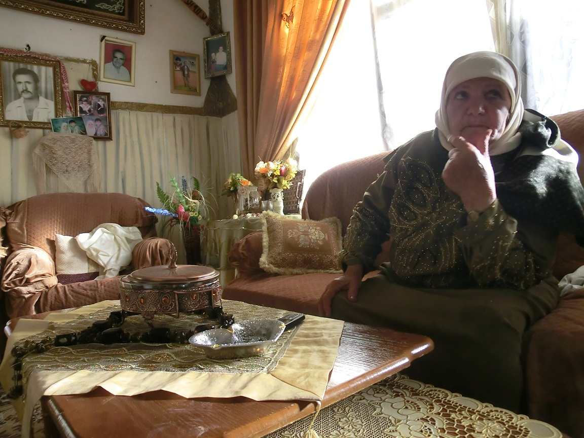När hon ser bilden på kameran kysser hon displayen och börjar gråta. Det är svårt att avgöra hur gammal är. Själv tror hon att hon är 75 men hennes barnbarn Jihad gissar på närmare 90. De hade inte så bra koll på sånt här förr i tiden förklarar han. Amni är en liten rund dam med sjal över håret och har inte många tänder kvar i munnen som omges av mörka skäggstrån. På hakan har hon ett streck tatuerat, en traditionell tatuering som var vanligt bland kvinnor förr i tiden berättar Jihad. Han säger stolt att hennes man brukade åka till Tyskland och vara otrogen tills hon tog ifrån honom hans pass, rev det i bitar och brände upp det. Hon var starkare än honom, säger han. Yamen var efterlyst mellan 2001 och 2004 då militären till slut hittade honom i ett flyktingläger. I eldstriden som följde lyckades Yamen skjuta ner två israeliska soldater innan han själv dödades, 26 år gammal. Han hade varit medlem i PFLP och studerade journalistik. Som familj till en martyr händer det att familjen Faraj fortfarande blir trakasserad av militären eftersom de är en viktig symbol i samhället. Så sent som månaden innan mitt besök arresterades Yamens bror Ali och hölls i en vecka utan åtal eller misstanke. I kvartert brevid bor Hussein Nassars familj. Hussein avtjänar ett livstidsstraff  Nafha-fängelset och har varit skild från sin familj i 10 år. Han är nu 30 år gammal och har två döttrar, den ena var fyra månader när han greps, den andra befann sig fortfarande i hans frus mage. Hussein får inte längre ta emot pengar från sin familj och på grund av detta har han den dag vi träffar hans mamma befunnit sig i hungerstrejk i 31 dagar. Mamman säger att Hussein lider av njursten och dålig tandhygien men att han inte får någon vård i fängelset. Hans mamma är själv sjuk och har inte kunnat träffa sin son på över ett år.