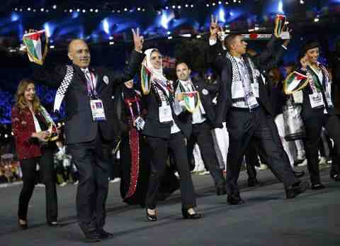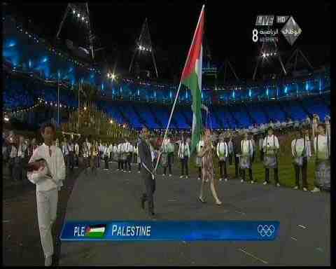 Palestinian athletes entering the Olympic Stadium. Nisa Zainab, Nada Omar Offendum & Fowzia Salie.