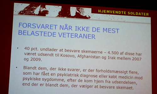 Den oberoende danska forskningsinsats som Det Nationale Forskningscenter for Velfaerd SFI genomfört på uppdrag av Soldaterlegatet är efterföljansvärd. Jag vill att den svenska veteranforskningen speglas i det danska materialet vid den forskningskonferens som genomförs på Försvarshögskolan våren 2013. Då kommer Fredsbaskrarnas studie Mörkertal i utlandsförbanden att vara genomförd.