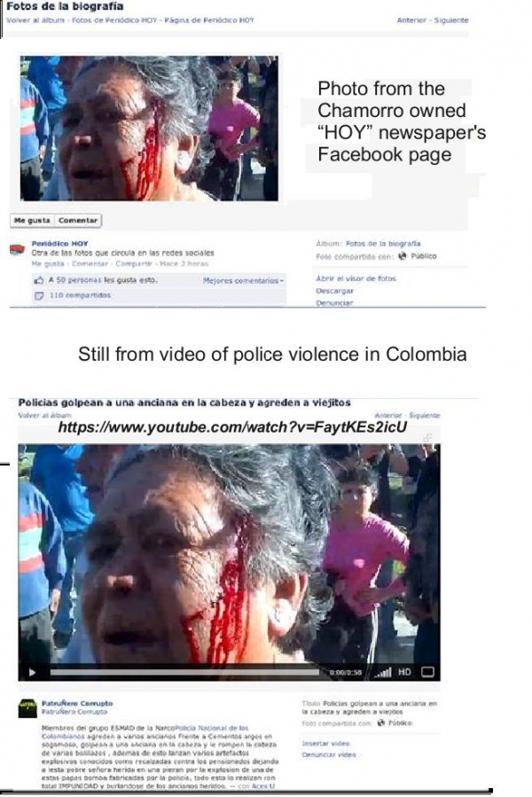 This tactic has been used  flagrantly by corporate media for as long as anyone can remember to smear target governments everywhere. The latest example here in Nicaragua is of the right wing Chamorro family owned newspaper Hoy. On the Internet, they deceitfully used a photograph of an elderly woman beaten up up the Colombian security forces to suggest non-existent violence by Nicaraguan police against vulnerable elderly citizens.