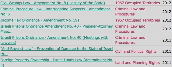 Det finns mer än 50 israeliska lagar som diskriminerar palestinska medborgare i Israel inom livets alla områden, inklusive deras rätt till politiskt deltagande, tillgång till mark, utbildning, statliga budgetmedel, och straffrättsliga förfaranden. Några av lagarna kränker också rättigheterna för palestinierna i 1967 i ockuperade områdena och palestinska flyktingar.