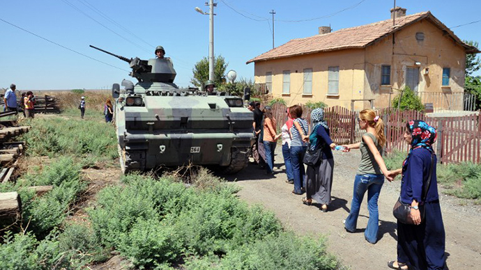 Turkiska soldater står vakt i toppen på en APC (Armored Personnel Carrier) medan pro-kurdiska Fred och Demokrati partiets medlemmar bildar en mänsklig kedja under en demonstration för att protestera mot den turkiska arméns politik gentemot syriska kurder den 3 augusti 2013 i Mardin, sydöstra Turkiet.