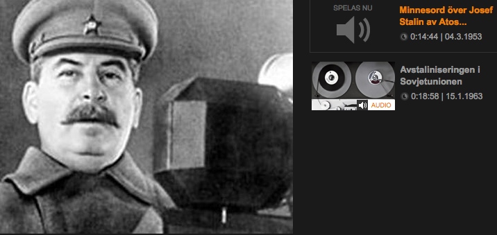 "Josef Stalin begravdes den 5 mars 1953 och med honom en epok av fångläger och personkult. I det första klippet är det Atos Wirtanen som läser ett minnesord över Stalin. Här är det inte fråga om någon kritisk röst, Atos Wirtanen hyllar Stalin utan förbehåll. De enda deportationer och fångläger vi får höra om är de som Stalin själv fick uppleva....
