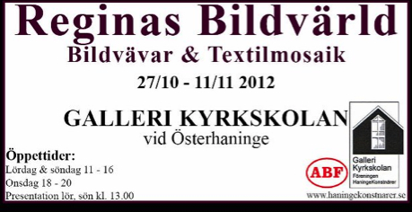 Bildvävar & textilmosaik, konstutställning av Regina Mucwicki Mabrouk. 27/11 - 11/11 2012. Galleri Kyrkskolan vid Österhaninge.