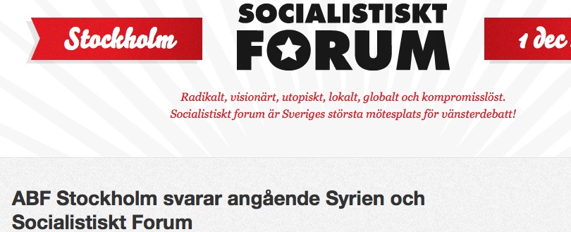 Vi har i det aktuella fallet inte varit tillräckligt uppmärksamma på vad föreningen Syriensolidaritet står för och har uppmanat arrangören av seminariet att dra sig ur Socialistiskt Forum då vi, ABF Stockholm, inte vill ha något att göra med uppenbarligen öppna anhängare till den hänsynslösa diktaturregimen i Damaskus.